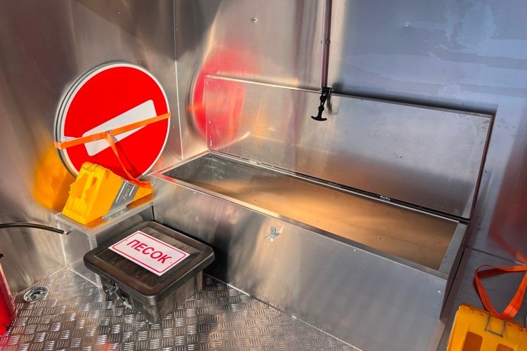 Ящик для противооткатных упоров. Каждое транспортное средство EX/II в обязательном порядке комплектуется не менее чем двумя противооткатными упорами (башмаками), соответствующими массе автомобиля. Для их хранения на раме автомобиля устанавливается специальный металлический ящик с надежным замком.