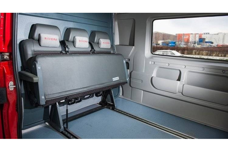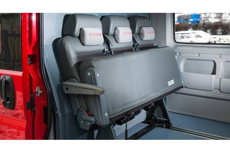 Диван-трансформер «Ривьера» складывается и передвигается вдоль пассажирского отсека по направляющим с пошаговой фиксацией (5 см). Диваны оборудованы трехточечными ремнями безопасности и подголовниками, имеют плавную регулировку спинки. Ширина трехместного дивана – 1400 мм