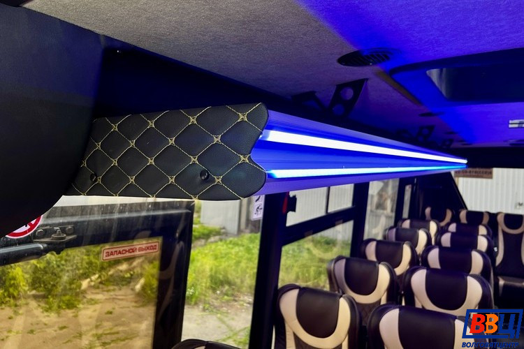 Установили удобные багажные полки над каждым рядом кресел. Это позволит разместить ручную кладь каждого пассажира. Чтобы удобнее передвигаться по салону, профили крепления сделаны удобными для захвата руками. Дополнительно встроили две системы освещения: одну мягкую атмосферу, вторую яркую рабочую.
