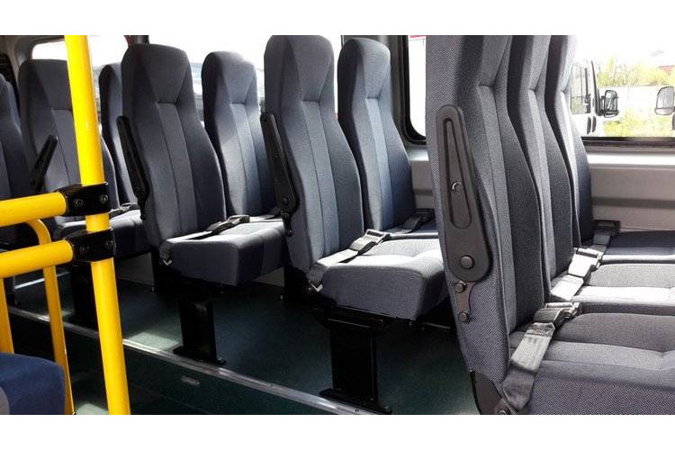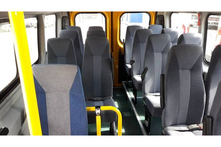 Комплектуется сиденьями для детей, а так же одним для сопровождающего и одним для водителя. Все сиденья расположены по направлению движения и оборудованы ремнями безопасности, а также кнопкой вызова водителя, которая позволяет детям сообщить о необходимости остановки.
